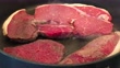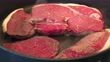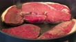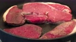Frying large slices of rump steak in a frying pan.