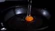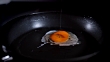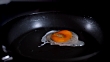 Slow motion close up shot of frying sunnyside egg on a black pan.