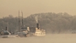 Fuming ship and fog from the sea in very cold Stockholm, Sweden. Skyline