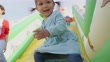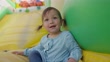 Three people, Japanese woman with her two little daughters playing on inflatable bouncy castle in amusement park