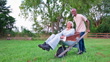 Fun loving senior black couple playful in the yard with a wheelbarrow