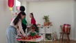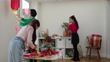 A static medium shot of a family decorating their living room for Chinese New Year at their home in Newcastle Upon Tyne, England, patterned imitation fire crackers used to scare away evil spirits are laid out and ready to be hung up.