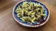 Fusilli Spiral Pasta in the Authentic Plate with Dried Meat, Bacon, Jerky on Wooden Kitchen Counter Stock Video Background - cellentani pasta