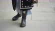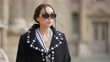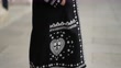 PARIS, FRANCE - MARCH 27: (SLOW-MO) Gabriella Berdugo wears black square sunglasses from Versace, a silver pearls necklace, a green stones necklace, gold chains necklaces, a blue with black and white borders strap print pattern V-neck / wool tank-top from Filippa K, a matching blue with black and white borders strap print pattern braided wool slit / split midi tube skirt from Filippa K, a black wool with embroidered white flower pattern long coat from Moonsoon, a half black shiny leather and half black and beige triangular print pattern Triangle handbag from Prada, white high socks, black plastic with embroidered white logo knees rain boots from Chanel, during a street style fashion photo session, on March 27, 2023 in Paris, France. (Footage by Edward Berthelot/Getty Images)