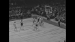 VS game with notable players for Holy Cross in dark uniforms: #22 Togo Palazzi #24 Tom Heinsohn #21 Joe Early #12 Walt Supronowicz and for St John's in light uniforms: #11 Ed Cunningham #27 Michael Parenti #20 Martin Satalino, team captain / cutaways fans & students in bleachers / buzzer to end game / crowd cheers.