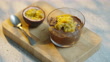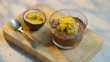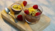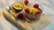 Chocolate mousse. Garnished with raspberry and seeds of passion fruit. Spooning raspberry compote. Adding redcurrant. Served on wooden cutting board. Stone surface. Light effect.
