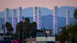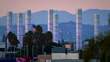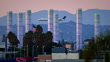 Gateway to LAX illuminated neon tubes at twilight with airplanes crossing through foreground and background: Gulfstream G-4 & Embraer-CRJ - HD stock video