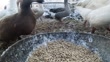 Geese and ducks eating pellets from a metal bowl covered with snow in winter. Close up shot of poultry feeding.