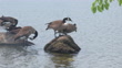 A group of Canada Geese relaxing in Loch Raven reservoir near Baltimore, MD, during the late spring. A more dominant male pushes another male off a rock.