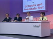 General Election 2001: Tory comments on Labour landslide; ITN ENGLAND: Hampshire: Romsey: EXT Former Prime Minister Baroness Thatcher from car and waving TCBV Thatcher with press around Baroness Thatcher (Former Prime Minister) speaking to press SOT - Could have an elected dictatorship London: Millbank: INT Prime Minister Tony Blair, Chancellor Gordon Brown, Health Secretary Alan Milburn and another sat for press conference Blair Press conference Tony Blair (Prime Minister) press conference SOT - Tories asking people to vote for them to reduce a Labour majority in an election that hasn't even happened London: EXT AT NIGHT Former Conservative Party Chairman Chris Patten, wearing dinner suit, from car and shakes hands with man INT Liberal Democrat press conference Press at press conference Charles Kennedy (Liberal Democrat Leader) press conference SOT - Government needs an effective opposition and that is not going to come from the Conservative Party Smith Square: Conservative Central Office: Conservative Leader William Hague to podium for press conference as Shadow Home Secretary Ann Widdecombe and others takes seats on platform William Hague (Conservative Party Leader) press conference SOT - We want to win as well as we can EXT Rory Bremner (Impressionist) doing an impression of Shadow Chancellor Michael Portillo SOT - 6 days left now to save the party, sorry the Pound Bremner, dressed as Portillo, talking to Jonathan Dimbleby CF = B0590976 OR B0281575 13.00.17 TO 13.02.44 MIX/FX PAB = B0548968 Order Ref: BSP010601013