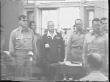 General Tomoyuki Yamashita is led into a room / Yamashita is led into a room filled with seated people / Yamashita stands at attention, surrounded by uniformed military / a group enters the room, sits at a small raised table at the head and sits and all standing sit as well / behind the desk are three uniformed officers before large American flags / Yamashita sits silently behind a table / the many spectators in the room watch the proceedings.