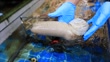 This image shows a geoduck being held by hands wearing blue gloves. The geoduck's body is light brown with distinct ridges. Its shell is lighter in color with some natural stripes. The blue of the gloves contrasts sharply with the geoduck's colors, making the geoduck stand out. The blurred seafood in the background further enhances the dynamic and visual appeal of the image.