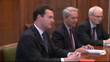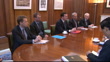 George Osborne meeting with Indian Finance Minister; ENGLAND: London: Downing Street:INT***SOME FLASH PHOTOGRAPHY***George Osborne MP (Chancellor of the Exchequer) seated at round table meeting for UK - Indian Economic and Financial Dialogue with Indian Finance Minister Pranab Mukherjee and other delegates / Osborne speaking / Mukherjee speaking (not heard)
