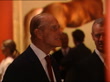 George Stubbs exhibition; MS Queen Elizabeth II (wearing purple suit and hat) looking at Stubbs painting after opening exhibitionMS Prince Philip, Duke of Edinburgh, examining one paintingMS Man presents Queen with leather bound copy of exhibition catalogue and Queen joking about the heaviness of the book