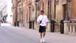 HAMBURG, GERMANY - MAY 01: (SLOW-MO) German actor Oliver Franck wears a white T-shirt with a multicolored letter print by Palm Angles, black shorts by Palm Angels, white socks by XOXO Hamburg, white sneakers by Adidas Sam Smith, a black and white bag by Off White and sunglasses by Tom Ford on May 1, 2021 in Hamburg, Germany. (Photo by Streetstyleshooters/Getty Images)