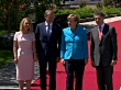 CLEAN: German Chancellor Angela Merkel and husband Joachim Sauer welcome President of the European Council Donald Tusk and his wife Malgorzata Tusk. G7 member states continue their 2-day summit at the Schloss Elmau in Bavaria, southern Germany.