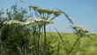 Giant hogweed (Heracleum mantegazzianum) a poisonous exotic plant growing in a hedgerow in Northamptonshire England.