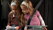 Girl sitting down next to twin sister in back seat of car and securing seat belt around self / sisters playing video games on portable devices - HD stock video