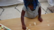 Girl stacking scrabble tiles on wood coffee table in living room, tilt down