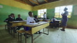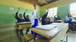 Rural African School Classroom full of teenagers in school uniform with hands raised. They are sitting together on wooden desks. The children are all between 14 -17 years old. There is light falling in from the window. The children are eager to learn and want the female teacher’s attention. The learner answers the question standing up while talking as sign of respect. The school is in a rural setting outside Malealea in Lesotho, Africa.
