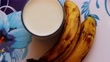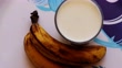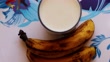 Glass of milk and banana on the plate at morning for breakfast. Table top spin view concept.