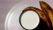 Glass of milk and banana rotate on white background at morning. Banana smoothie in glass for healthy breakfast.