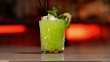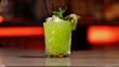 Front view of a Godzilla cocktail on a bar counter. The background of the image is defocused lights and the back of the bar. This cocktail has Kiwi as a garnish on the cold drink.