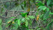 Golden-plumed parakeet, leptosittaca branickii, eating fruit on tropical tree, Colombia.
