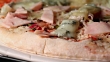 Gorgonzola cheese pizza being cooked in time lapse video, cheese melting and delicious color in the ham and the tomatoes.