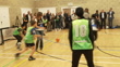 Various shots of children and adults playing sport in hall with people watching around outskirts