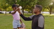 A grandfather and granddaughter spending time together in a park practicing baseball.