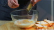 Bread pudding preparation step. Grating nutmeg in mixture of orange zest, honey, liquour and milk. Chopped buttered bread slices next to kitchen bowl.