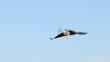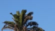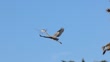 Great Blue Heron flying with nesting material into palm tree in slow motion, Southern California.