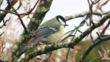 A Great Tit, Parus major, in a bush in an Ambleside garden, UK.