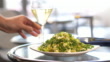 Green salad and white wine being placed on a glass table in a wine bar. - 4K stock video