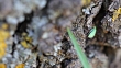 Snout beetle in tree trunk laying eggs, finally a big ant cames and the beetle drops himself from the trunk...