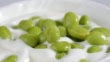 Green soybeans falling on yogurt bowl, slow motion.