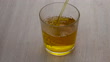 Green tea brewed pouring into transparent glass on pale wooden table background. Healthy chinese tea - HD stock video