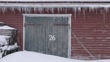 Greenland, Qeqertalik, Icicles hang above door to snow-covered abandoned fishing terminal on Transitøen Island in settlement of Aasiaat on overcast morning - 4K stock video
