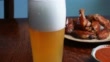 Plated Grilled, baked chicken wings with a side of wing sauce and a frothy cold beer