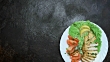 Grilled chicken breast served on plate with fresh tomato and lettuce. Black background. Dolly shot