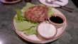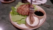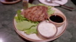 Grilled pork chop steak with vegetable salad and serving with dipping homemade steak sauce, Worcestershire sauce and Bechamel sauce on a white ceramic plate in a restaurant. Italian food - 4K stock video