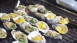 Grilling fresh oyster seafood topped with oiled green onions and cheese - 4K stock video