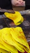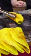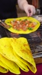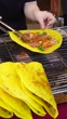 Female hands grilling a rice cracker, a Vietnamese style taco stuffed with dried shrimp seafood, minced pork, chopped green onions, deep fried onions, and quail eggs