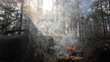 Ground level shot into the sun, of smoky, burning resin-impregnated wood next to fallen snag, after prescribed burn in pineland - 4K stock video