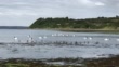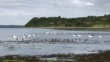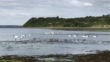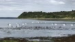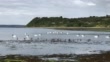 A group of black-necked swans and water birds swim and feed in a natural lake. Chiloe Island. Chile