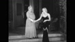WS group of budding actresses wearing evening gowns stands on outdoor steps with famed operatic contralto Madame Ernestine Schumann-Heink as the Western Association of Motion Picture Advertisers presents its 1931 "baby stars," beauties whom it thinks will have promising film careers / starlets Rochelle Hudson and Sidney Fox shake hands with Madame and kiss her quickly; Madame wipes her lips after Fox's kiss / each of the starlets introduces herself to Madame, shakes her hand, and exits; starlets include Hudson, Joan Marsh, Karen Morley, Barbara Weeks, Fox, Marion Marsh, Anita Louise, Frances Dade, Joan Blondell, Constance Cummings, Marion Schilling, Judith Wood / 2-shot Louise and Schilling shake hands, speak excitedly, giggle / Hudson addresses camera, walks off