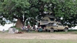 Group of visitors sitting in camping space under huge Mahogany tree with a tent build on the car.