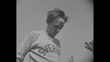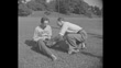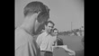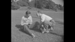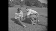 Gunder Hagg sits on the ground wearing a 'Sverige' (Sweden) sweatshirt as his trainer vigorously massages his left leg / CU his right bare foot; pan up to his face / as others look on, he pulls on the sweatshirt / Note: exact day not known