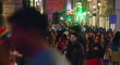 A bustling Halloween night scene in Plaza del Sol, Madrid, shows crowds filling the street in vibrant, festive energy. People are dressed in various costumes, from classic Halloween characters to creative and colorful attire, adding layers of excitement to the atmosphere. The faces range from painted skulls to characters with masks, and many are chatting, laughing, or taking photos. Bright lights from shop signs and street lamps illuminate the scene, highlighting the large group celebrating together in the narrow, lively street. The mood is celebratory, with a mix of adults, teens, and children blending into the Halloween spirit.Madrid, Community of Madrid, Spain - October 31, 2024